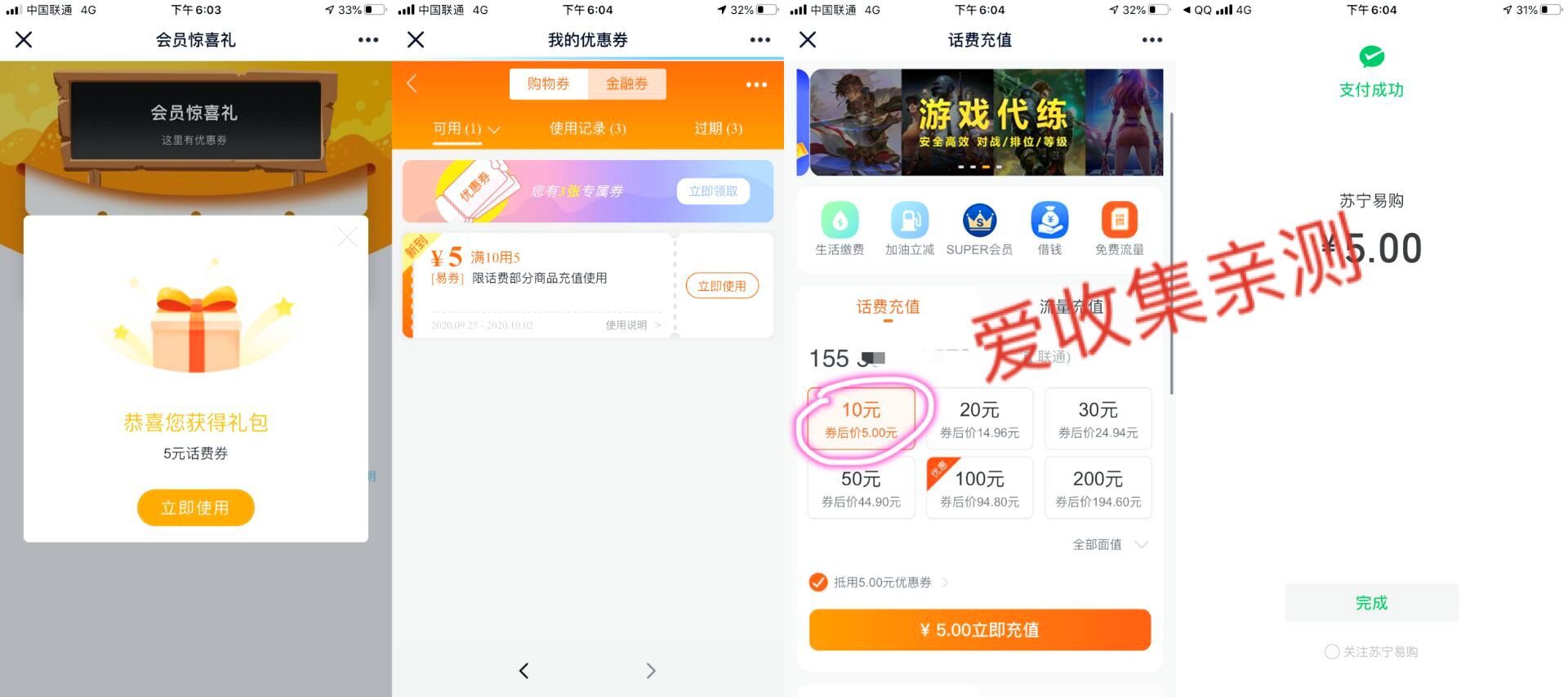 新用户无视,限老用户参加,不是所有老用户都能领到! 1、打开地址领取成功后->下载苏宁易购->我的优惠券里用充10元话费即可 2、如果支付没有微信支付选项,就退出就弹出微信支付选项,充值提示火爆问问客服 活动地址:https://sntc.suning.com/sntc-web/m/task/detail/RW558607774957780992.htm |