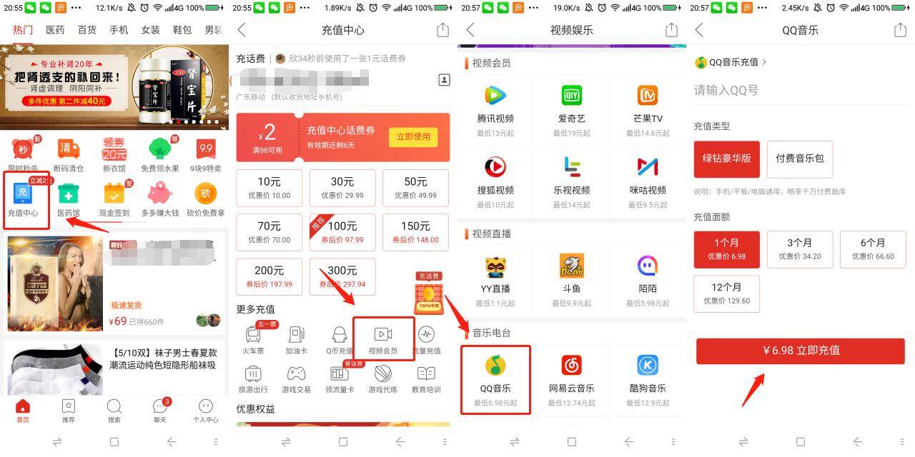 打开拼多多app->首页充值中心->视频会员->QQ音乐