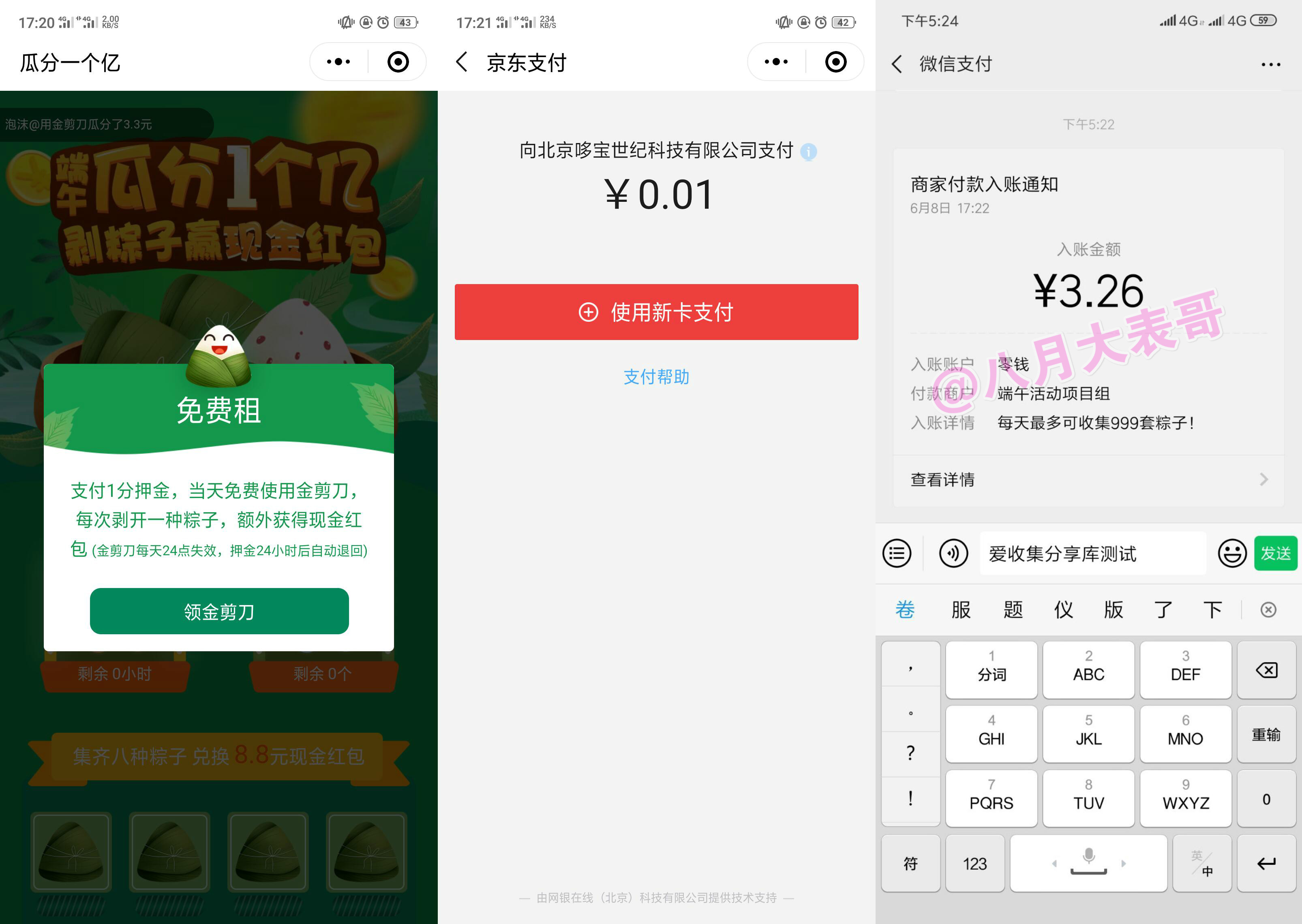 点击粽子->京东支付0.01抽奖->亲测3.26元秒到!