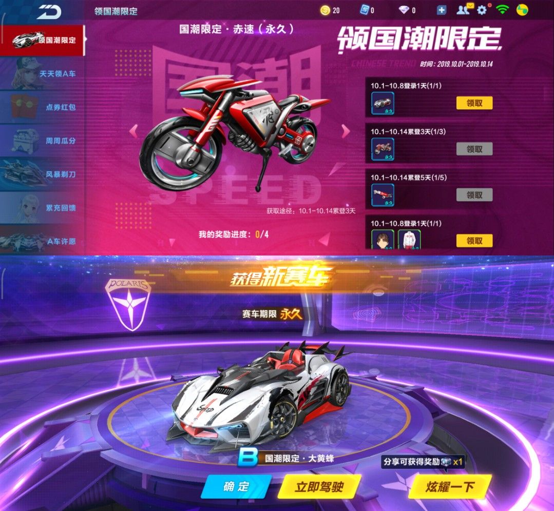 即可领取大黄蜂赛车永久+赤速摩托永久