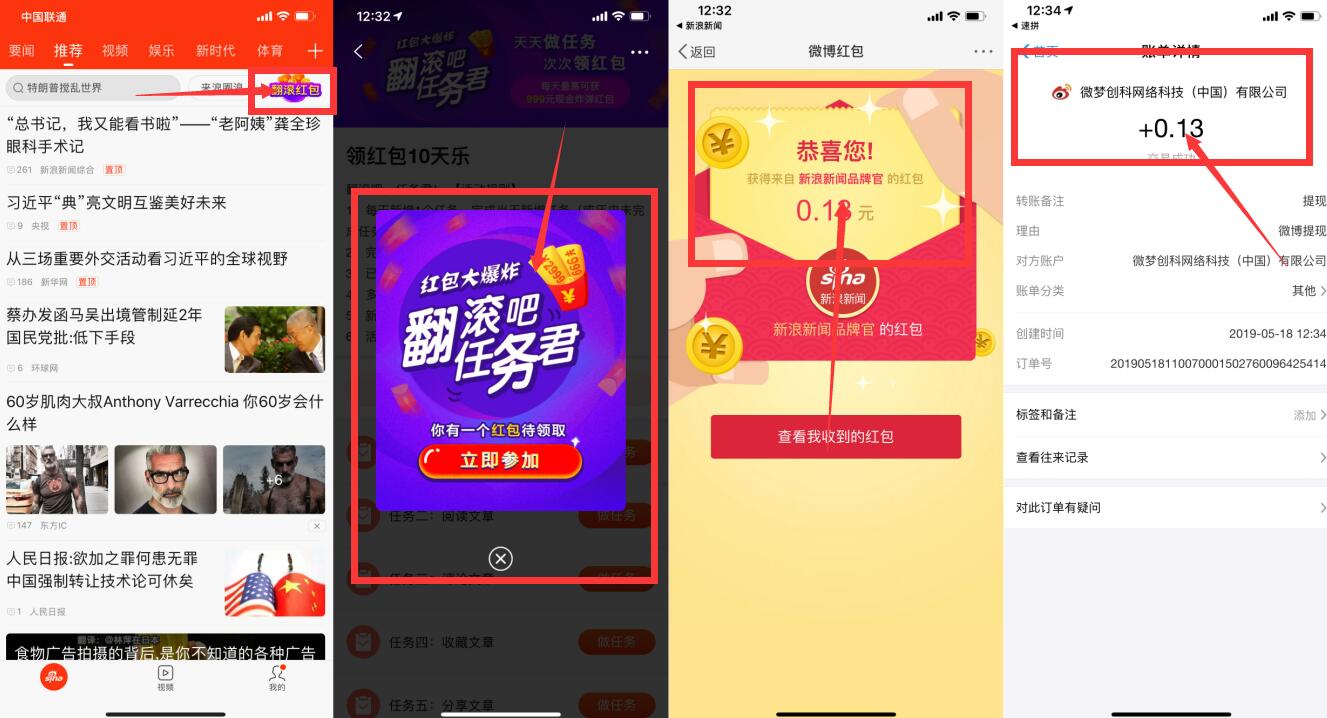 打开新浪新闻首页,点击右上角“翻滚红包”参与->亲测0.13元秒到!