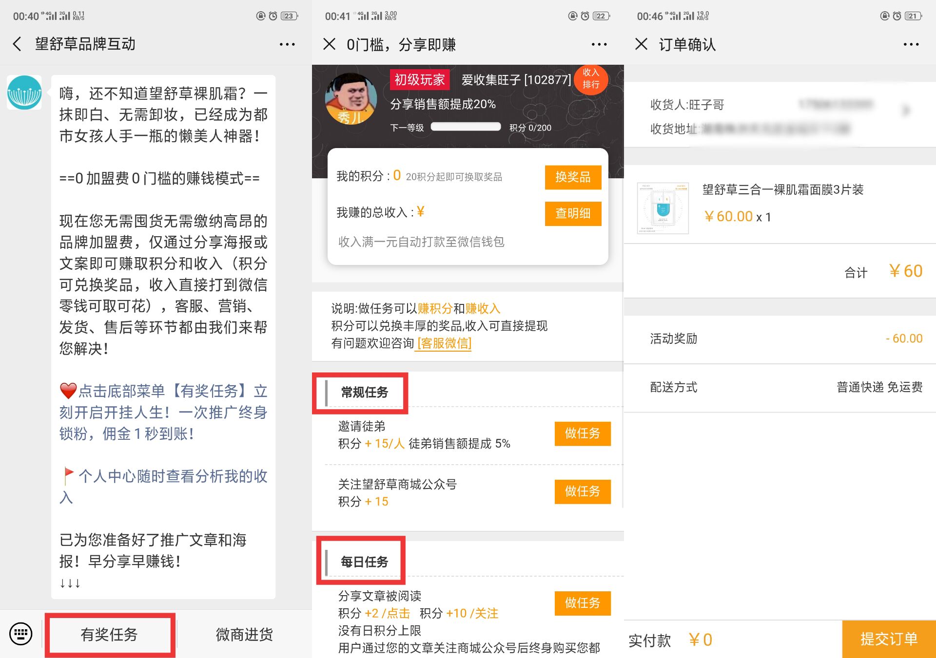 菜单栏->有奖任务->点进去完成任务满21积分->0元购买60元面膜~