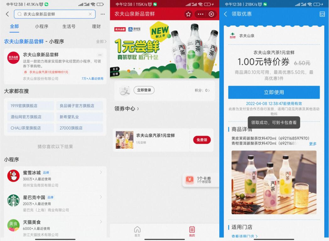 免费领农夫山泉汽茶1元尝鲜-领券指定门店使用!
