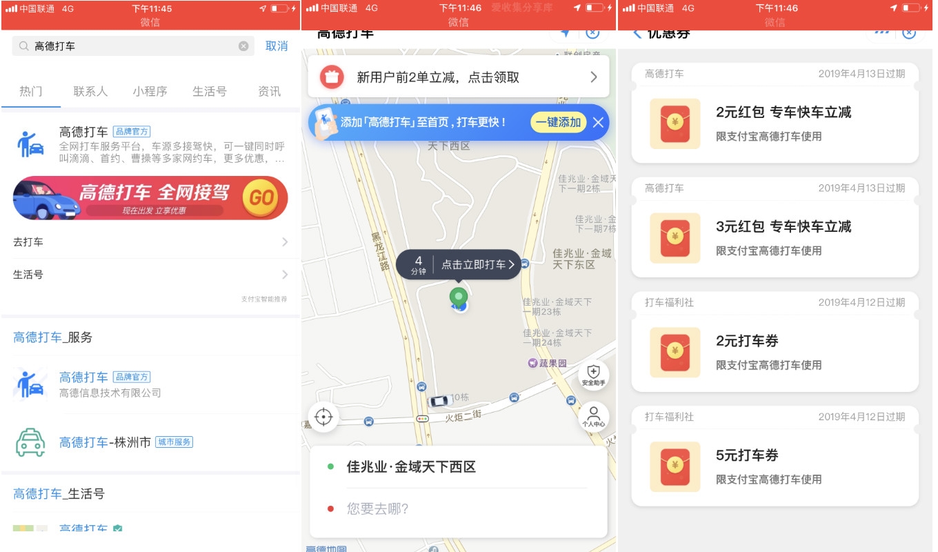 支付宝首页搜索:高德打车 进去上面横幅领取,亲测2张秒到~