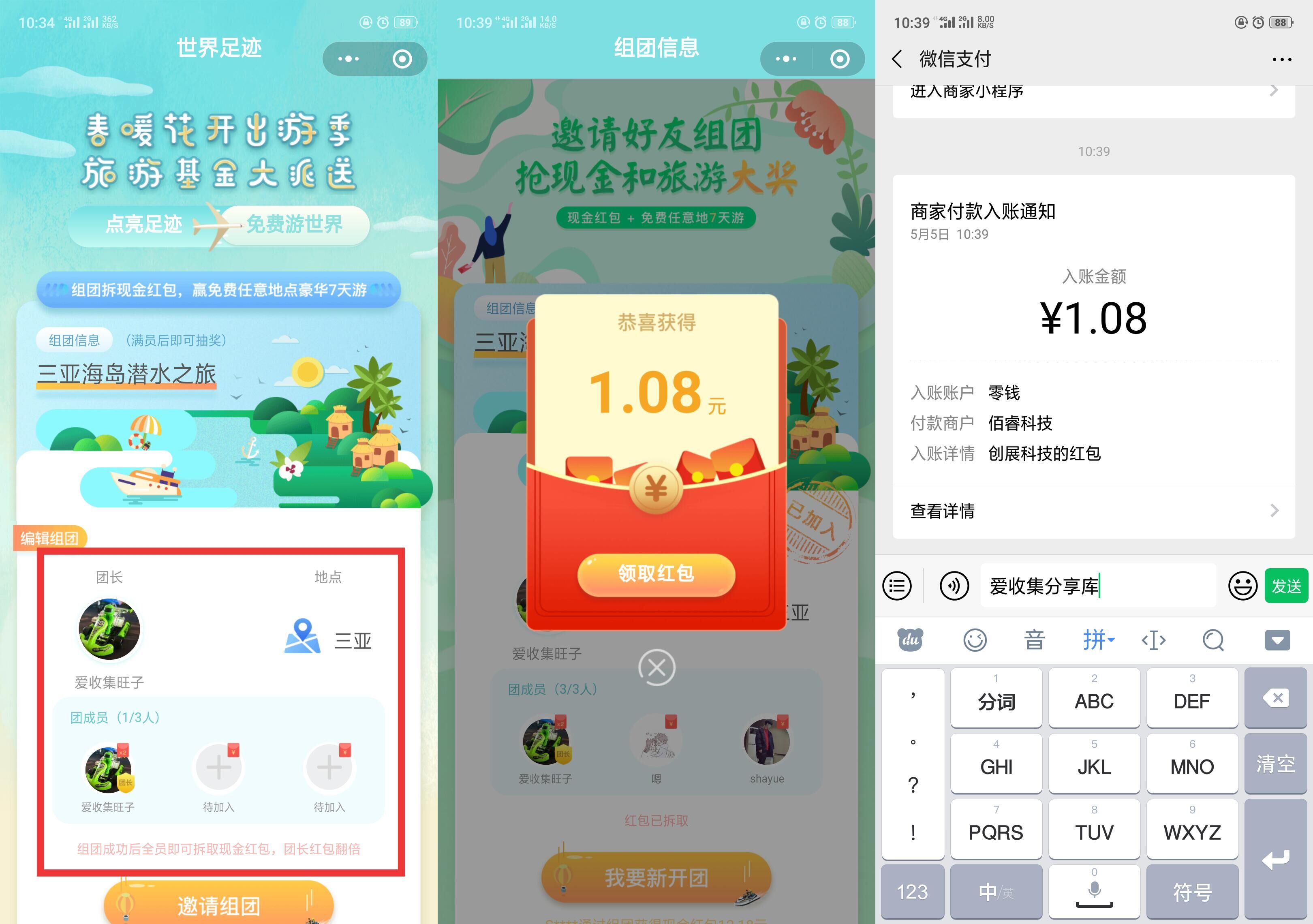 3个人都可以拆红包,红包秒到账,群里很多兄弟都说撸到了~