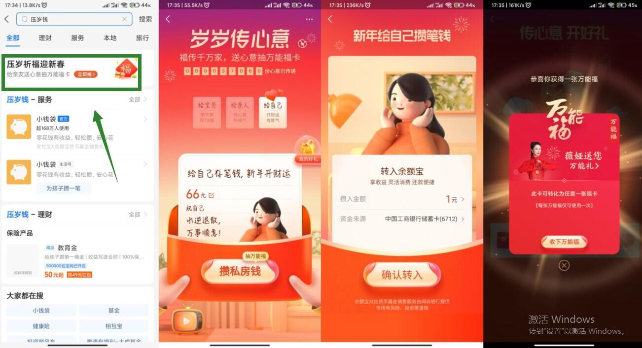 1、打开支付宝搜索“压岁钱”->点横幅进入->点击最后->给自己->手动修改