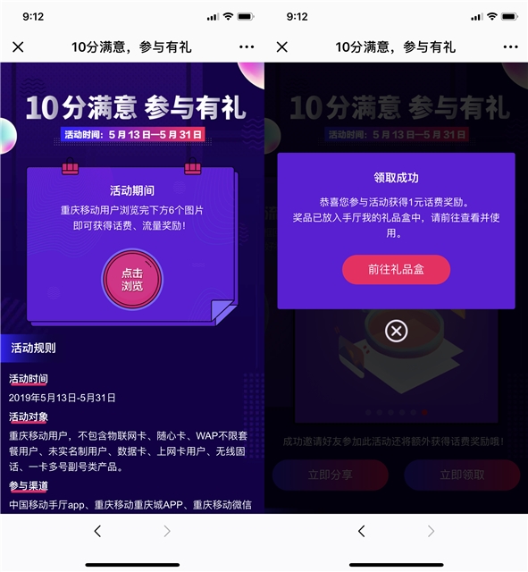 限重庆移动用户参与 浏览6个图片即可领话费或流量