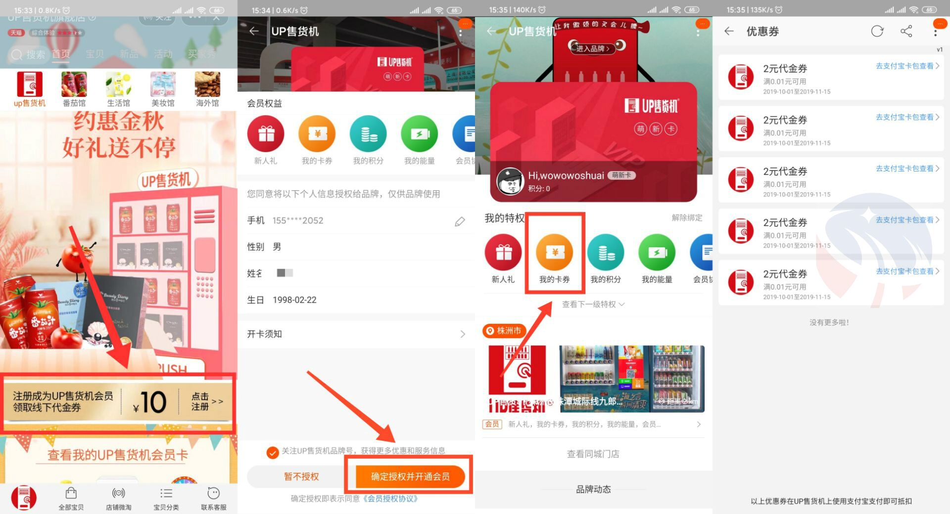 下拉中部横幅参与->注册后到我的卡券使用