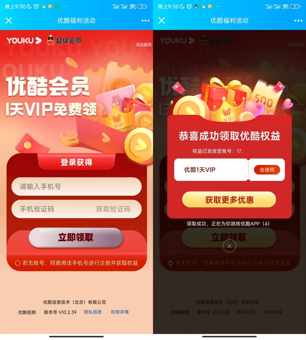 【免费领取优酷会员天卡】打开地址->输入手机号->直接领取秒到