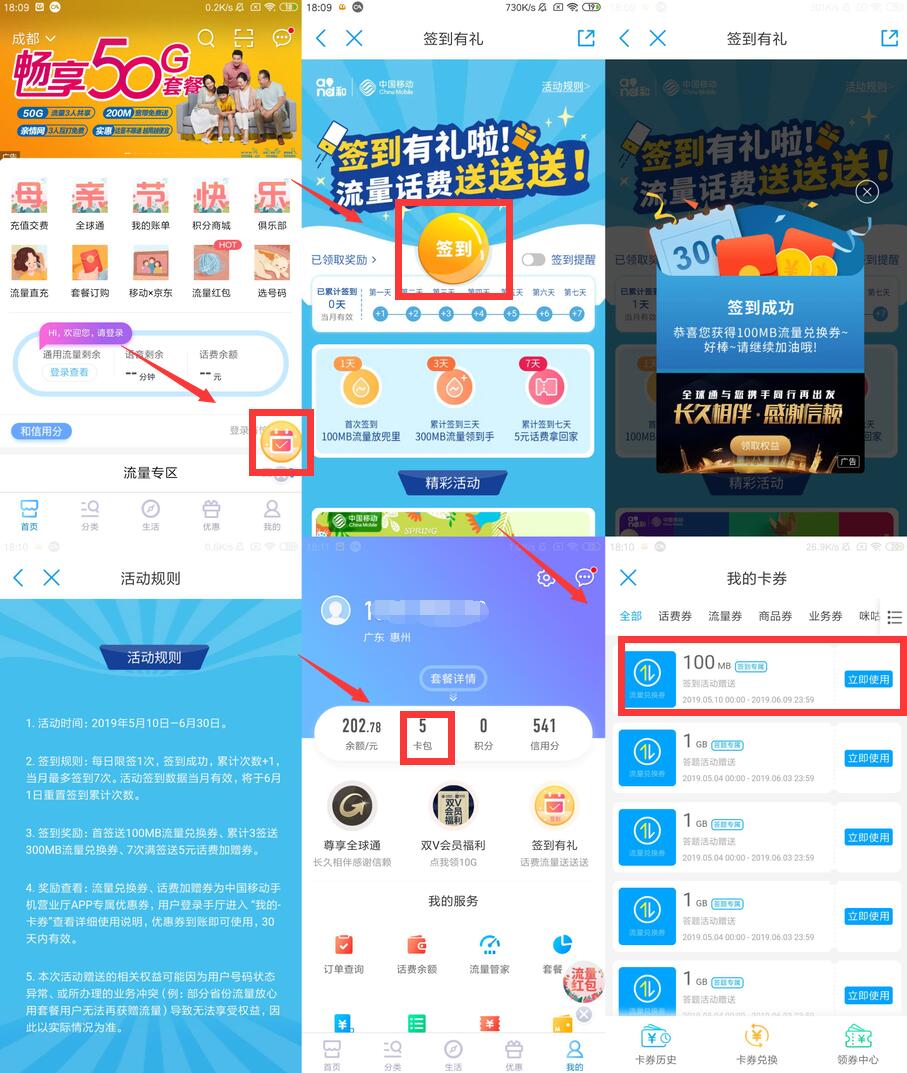 打开中国移动首页->右下角图标进入->签到1天得100M 签到3天得300M