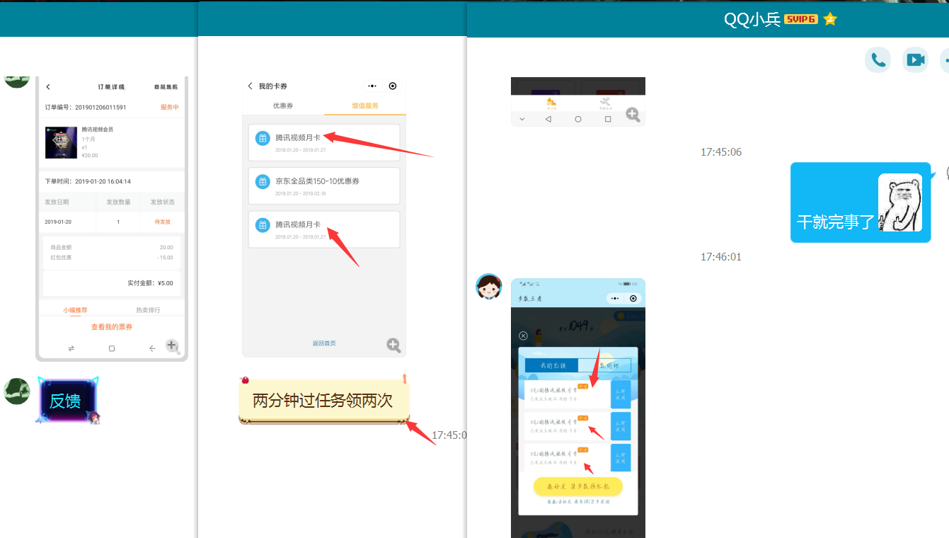 3、兑换成功后还是这个小程序右上角,我的兑换里会有一张5元购腾讯月卡