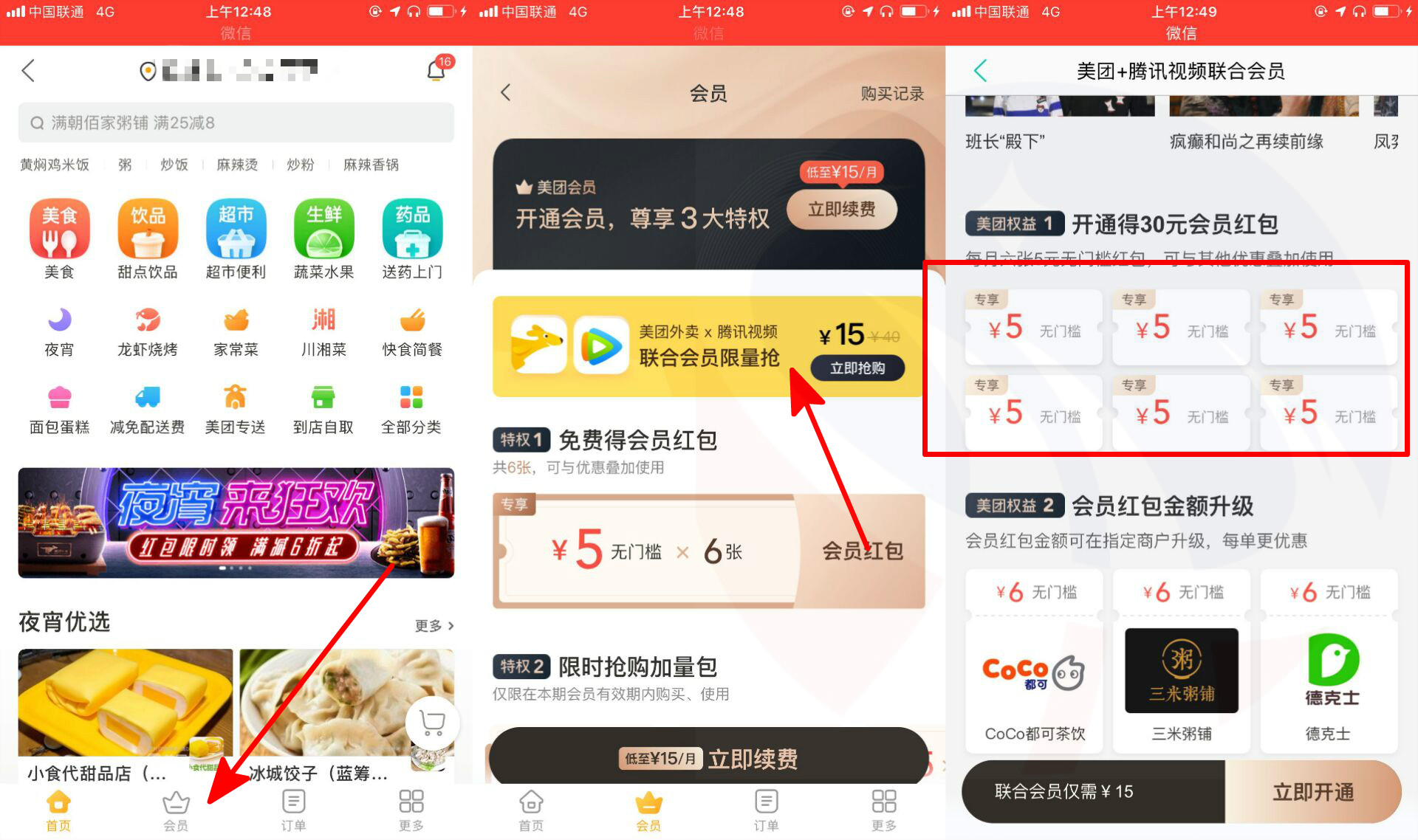 打开美团APP->外卖->会员->顶部联合会员限量抢