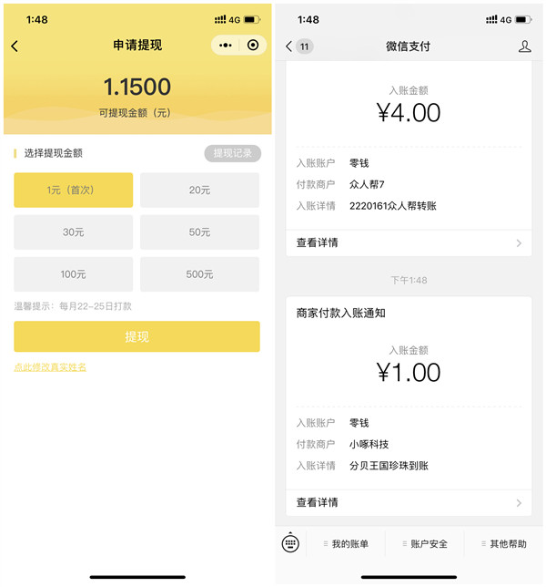 然后返回,分别得0.25+0.25,就满1元,提现秒到账~
