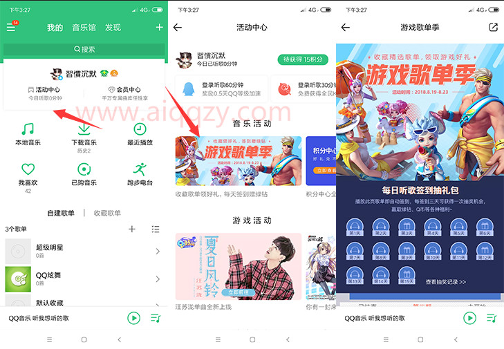 1、打开QQ音乐→我的→活动中心→游戏歌单季→签到3天→抽奖必中豪华绿钻或者Q币 PS:签到3天得1次抽奖机会,每次必中豪华绿钻或Q币,最高抽奖5次~ QQ音乐:http://sj.qq.com/myapp/detail.htm?apkName=com.tencent.qqmusic |