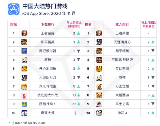 跟据App Annie数据显示:2020年11月中国大陆热门游戏收入榜单中,腾讯成功包揽前三 上线一个月的《天涯明月刀》收入首次超过了《和平精英》,喜提收入排行榜第2名。 网易《大话西游》重新回到了收入排行榜前十的位置,上榜的还有该公司的游戏《梦幻西游》。 而中国大陆热门游戏下载榜前三是《王者荣耀》、《和平精英》和《网吧模拟器》。 全球收入榜单较上个月相比并无明显变化,刚刚获得App Store以及