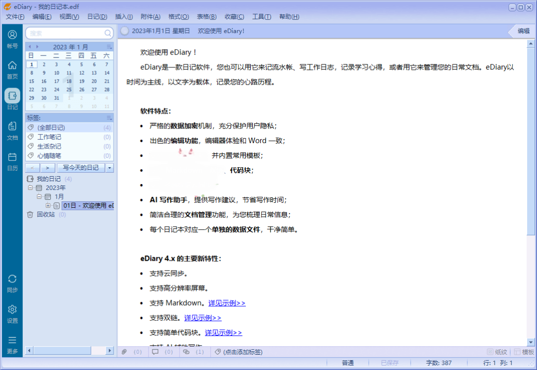 eDiary是一款免费的、久经考验的日记软件。eDiary 并非止步于日记,你也可以用它来记录工作日志、整理学习心得,或者用它来管理你的日常文档。eDiary 以时间为主线,以文字为载体,记录你的心路历程。