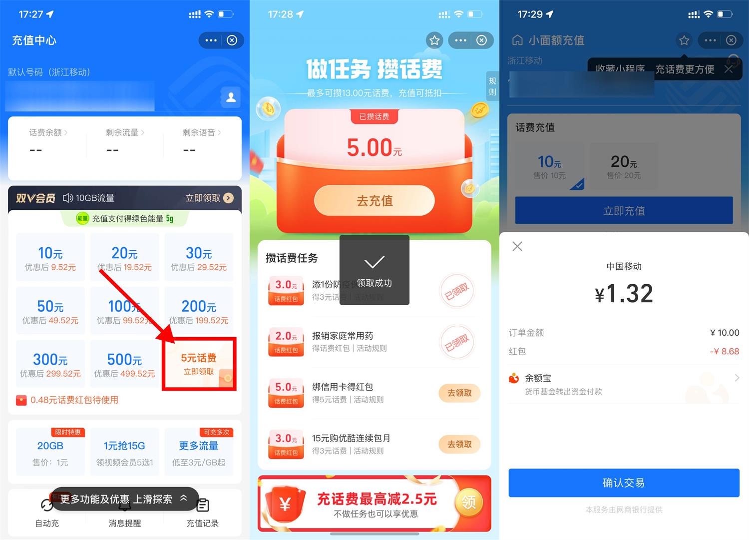 支付宝首页“充值中心”->右下角进入->完成简单的保险任务->领取话费红包