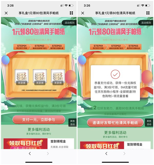活动步骤: 1、自己支付1元,拉2个好友各支付1元(或用QQ小号支付无限撸)得到商品券! 2、到了使用商品页不要直接自己开团,在下方加入他人团下0元下单,不然还要拉人 提示“当前活动火爆,请稍后在试”就是黑号,以后的活动都无法参加 PS:好友帮你支付1元也就自动开了他的团,所以不要浪费处! 活动地址:http://t.cn/E9Uas4t |