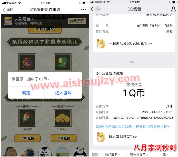 点击预订后,随便邀请2个好友,直接点兑换即可,八月中了1Q币