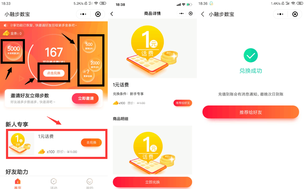 撸1元话费->挨个点击气泡领步数->步数兑换成金条>兑换1元话费