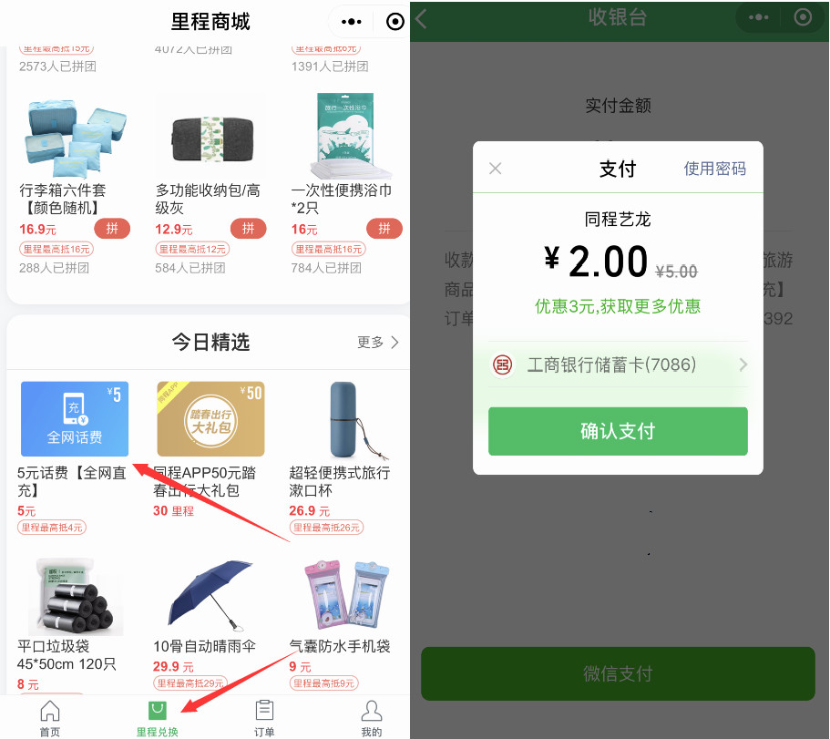 5月17日最新一期又开始了 跟之前不重复 步骤如下: 1.微信-我-支付-火车票机票-里程兑换-右边-吃喝玩乐-更多 2.下拉找到-5元话费-兑换(别直接付款)点零钱-选-工行卡 支付 3.看见有绿色字“本单可随机立减”就支付-没有就说明结束了 活动截至:2019.4.28~5.28 活动说明:http://t.cn/ESjrFWs |