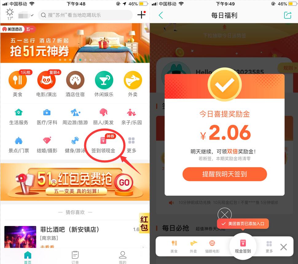 打开美团首页,找到签到领现金-点进去签到-亲测2元红包