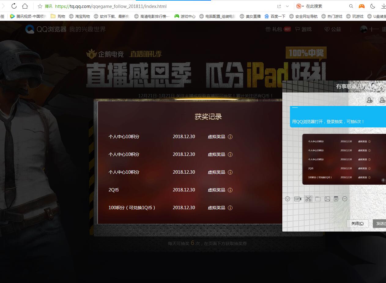 企鹅电竞复活,需要电脑QQ浏览器打开,可抽6次,亲测中2Q币,正常中6QB