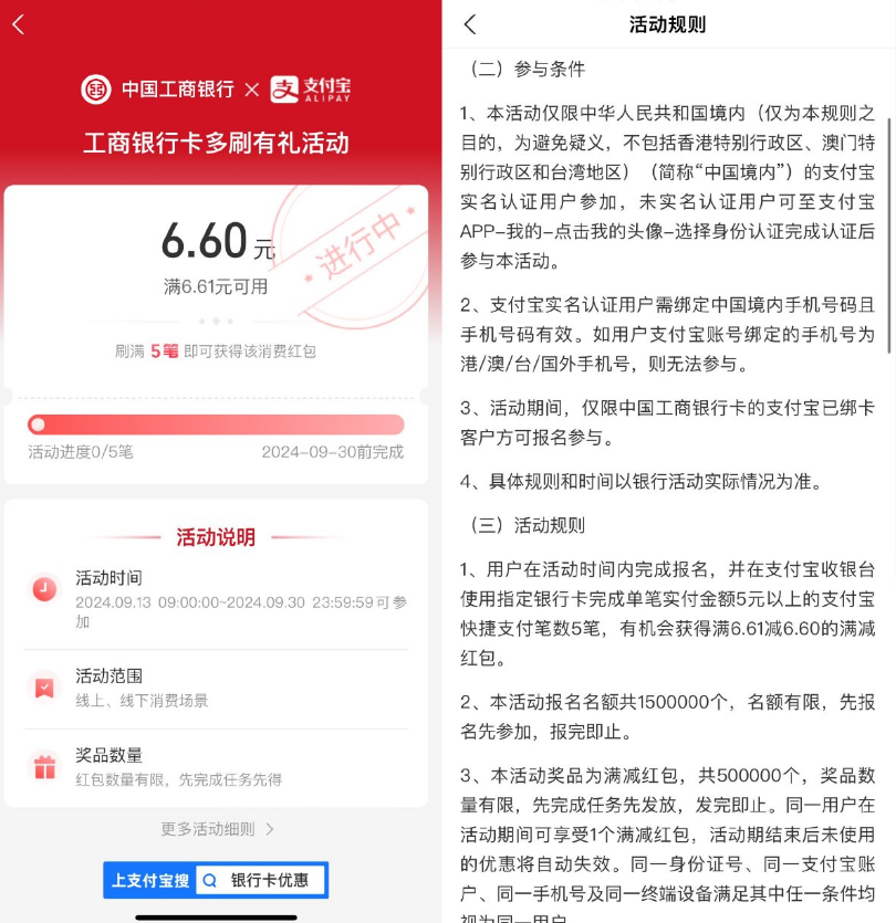 支付宝APP扫码->先去报名一下->然后工行消費5次5亓以上即可得6.6亓消费红包,限量50万份