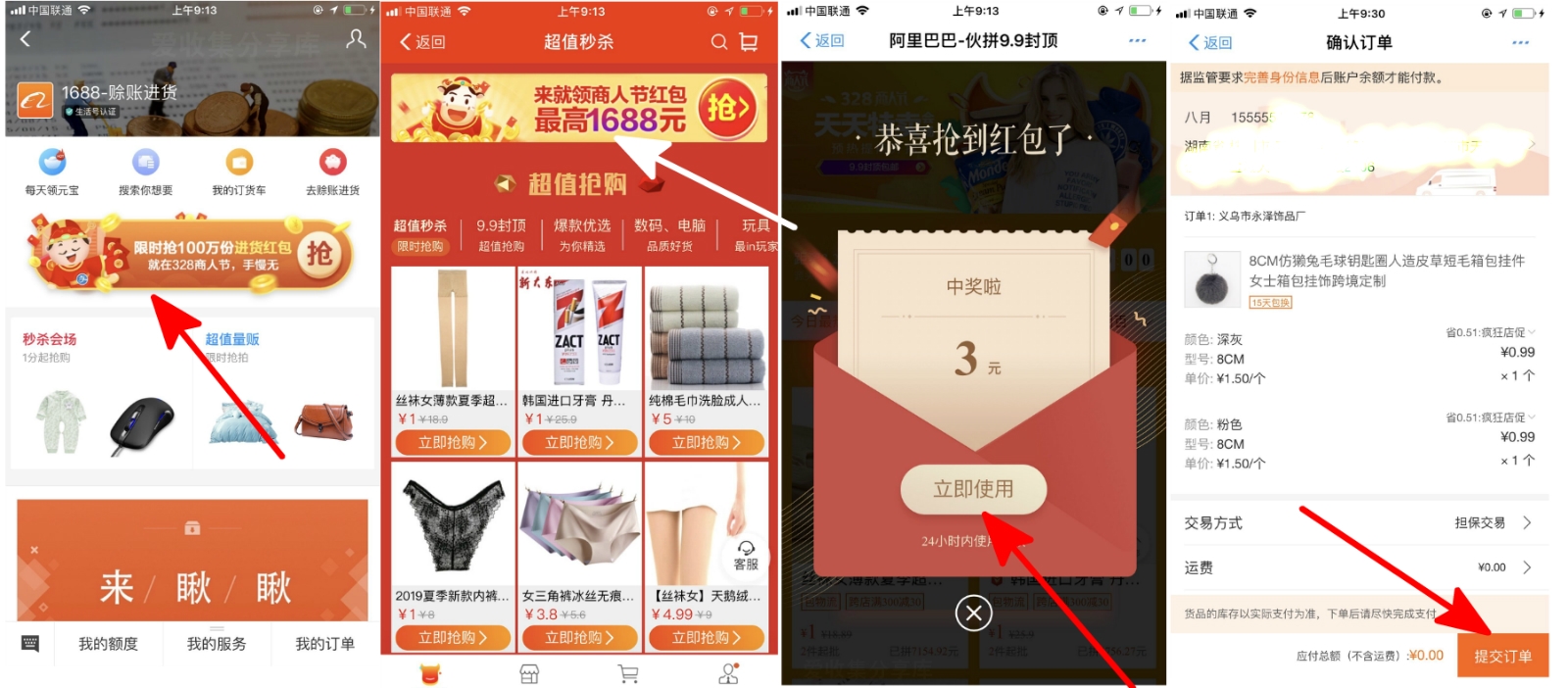 支付宝首页搜索:1688赊账进货 进去抢100万红包-再点上面横幅-亲测3元