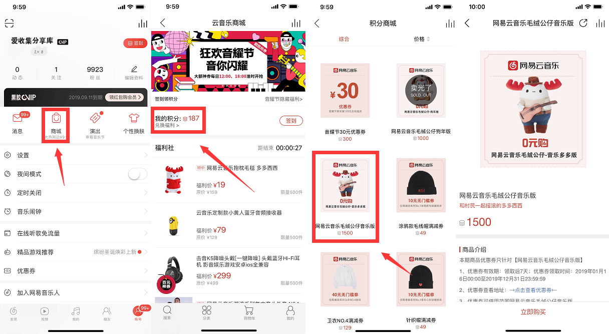 打开网易云APP->账户->商城->我的积分->下拉找到公仔->免费兑换有积分的速度上!