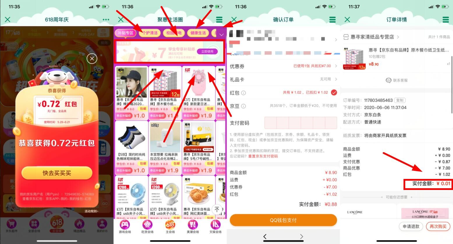 6月6日置顶新一期活动 步骤如下: 打开领红包地址领->再打开下单地址->认证学生随便乱填乱传图->认证后