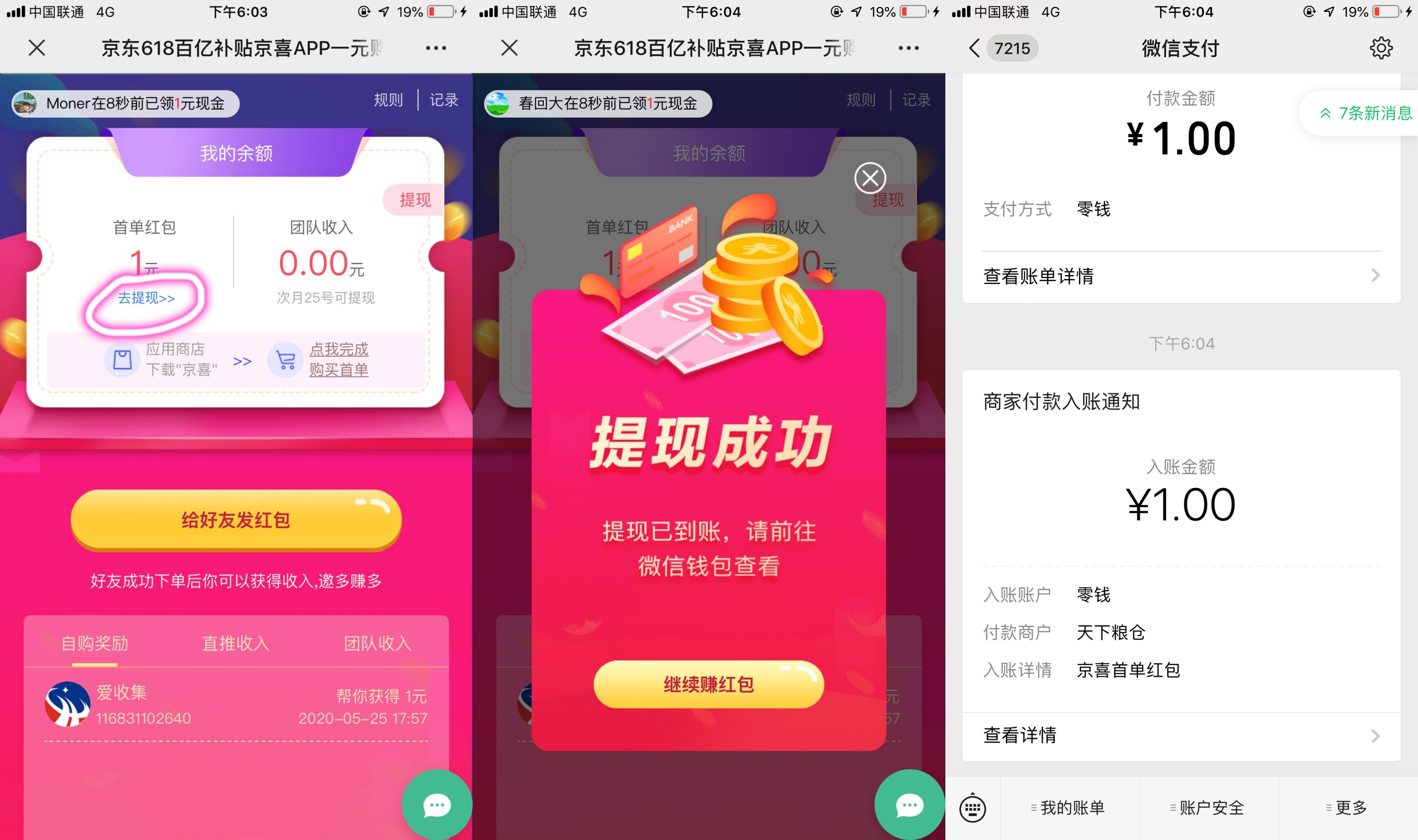 步骤如下: 1、复制链接到微信打开领1元->跟着提示下载京喜APP跳转完成1元首单 商品选个自己刚需的入团支付1元(我撸的牙膏)然后返回微信活动页面 2、等待提现页面出现“去提现”按钮提现1元秒到 (实测下单后要等几分钟才能提现) 活动时间:2020.5.21~6.30