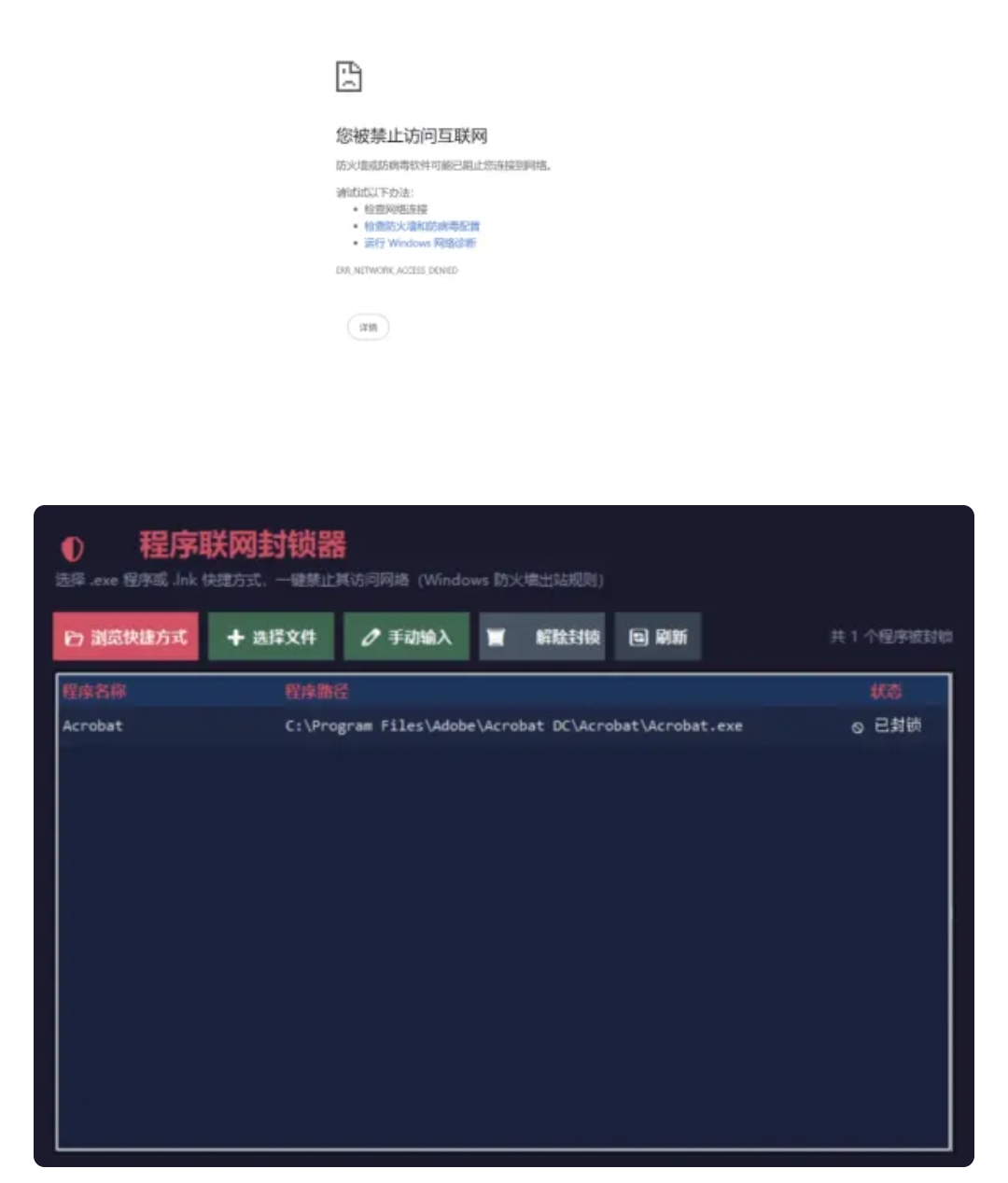 最近搞个工具软件不想让他更新,然后就禁止他联网,