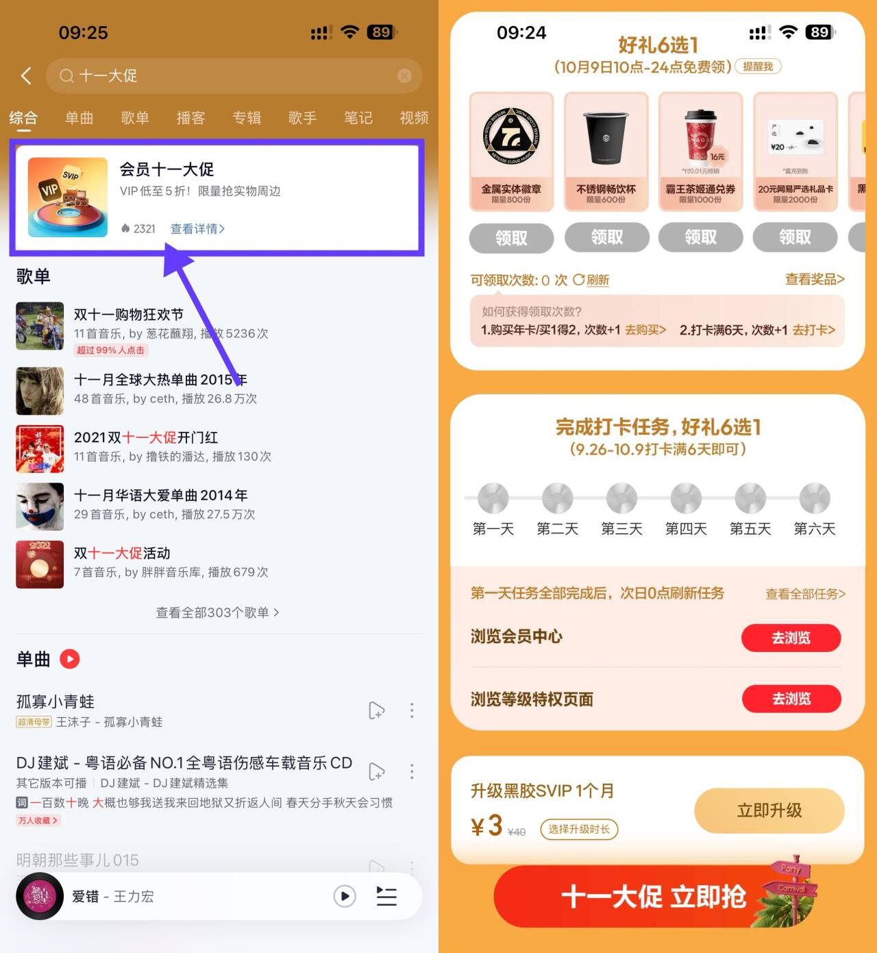 网易云音乐APP搜索“十一大促”->10月9日当天打卡6天的,可领99万份月卡