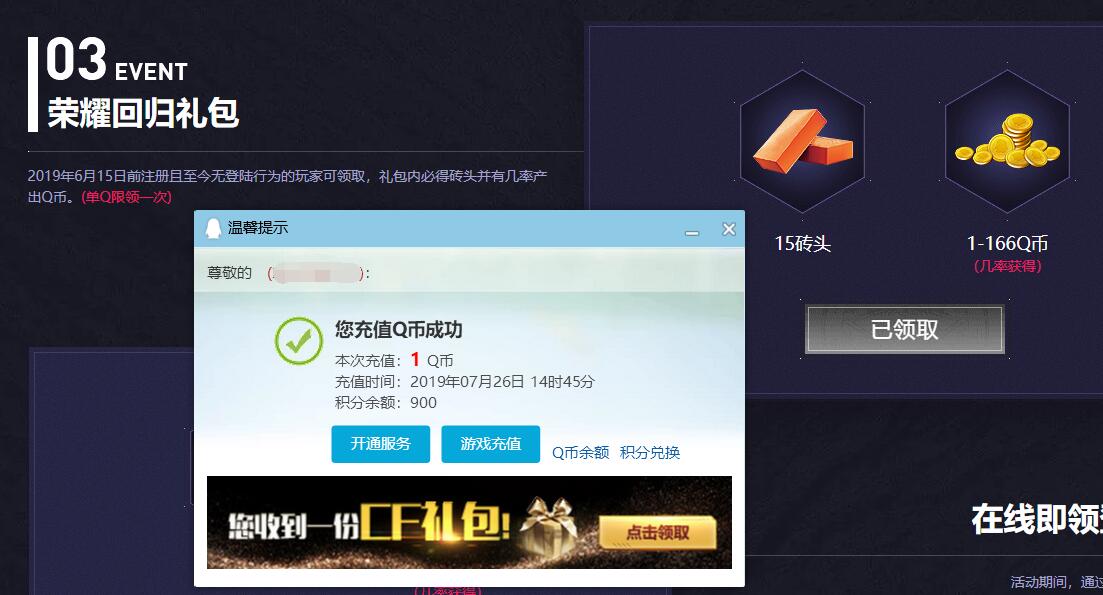 进入活动下拉找到荣耀回归礼包领取,高几率得1QB!