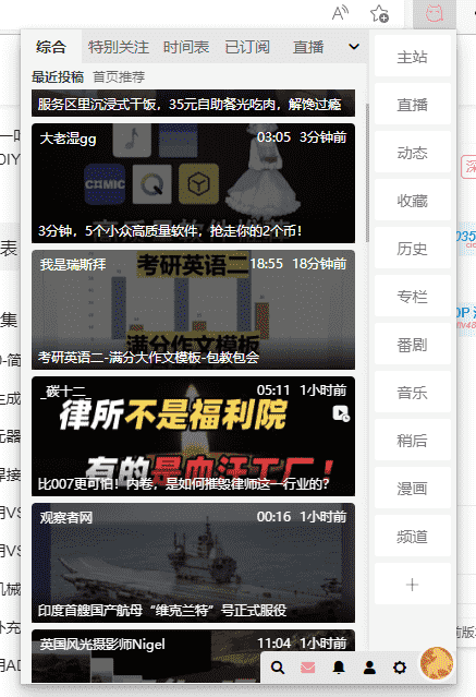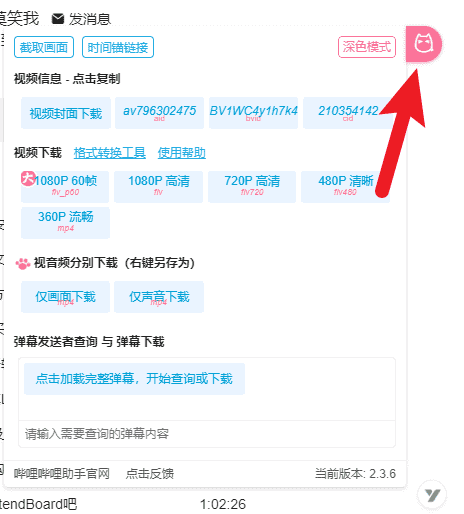 这是一款B站辅助插件,可以在不打开网页的情况下查看热门视频、 已关注UP主的更新状况 、已订阅的番剧、查收B站通知等功能。 插件安装十分简单,打开浏览器的插件管理界面并开启开发人员选项, 将插件拖动到里面即可安装。 在播放界面,点击视频右上方的log, 可以直接获取封面、视频、弹幕的下载链接。 比如说弹幕下载,只需点击一下,就可以下载, 同时它还分别提供了ASS和XML两种格式供大家选择! 使用此插件还可以一键给网页版的B站开启暗色模式, 非常适合夜间追番的朋友。 另外,在插件的设置选项中还隐藏了许多牛掰的功能, 这里阿水就不详细展示了,大家可以自行体验。最后需要注意的是, 如果你要下载1080P60帧及清晰度更高的视频,需要登录已开通大会员的账号, 否则最高还是只能下载1080P的视频。 |