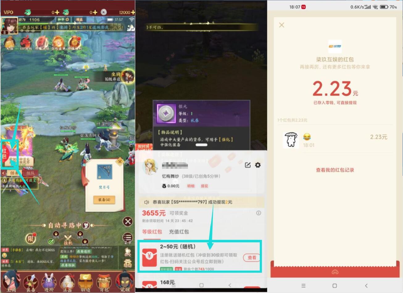 1、打开下载游戏180M->登录后提示实名叉掉->跟着指引走->玩3分钟到30级->到了级数 2、点左侧边红包标志->下拉页面2~50元提现->保存二维码扫码两次->5分钟后公众号推红包 PS:领了红包就卸载!如果剩余红包不多了没有了,就换个新大区! 下载地址:https://gzhldy.qijiugames.cn/main?channelSaleRecordId=26284