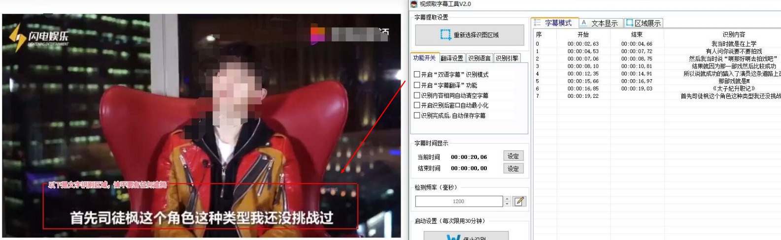 使用方法: 第一步:点击“选择识别区域”把视频中存在字幕的地方,全部框出来 第二步:启动识别,请注意,识别区域不能被任何东西遮挡,不然会影响识别。 第三步:点击左下角保存文字即可。 功能介绍: 支持“双语字幕”识别、字幕翻译、动态字幕等功能 支持字幕保存,导入等功能支持在线翻译功能。