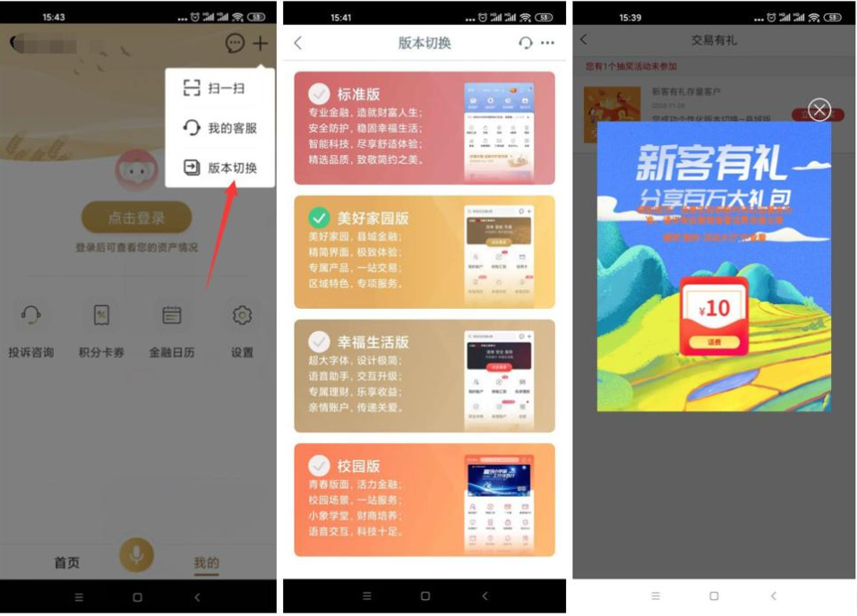 限有工商银行卡的参加,之前抽过的也可以抽 活动1中定向券没用,其它活动非必中! 1、打开工商银行APP->去活动大厅看有没“象惠星期四”活动->然后抽奖->“只有中了通用券才有用”->抽完后 2、我的->右上角点+号->版本切换->切换成“美好家园版”->(部分地区没有 就撸不了)->切换完成后会叫抽奖 3、抽完后->首页搜索“安全中心”->点功能->进入检测->检测完了会叫抽奖->没有就去活动大厅 4、上面步骤做完后->首页搜索“活动大厅”->点活动进入->下拉到底->里面能抽的活动都抽完 5、我的->右上角+号->版本切换->选择校园版->就会弹窗->抽中5元通用券点击使用->下单就会抵扣! |