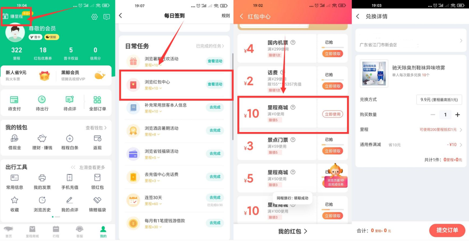 2、找到“10元里程商城”领取后点立即使用(前面签到送200里程+做个任务再领10里程)