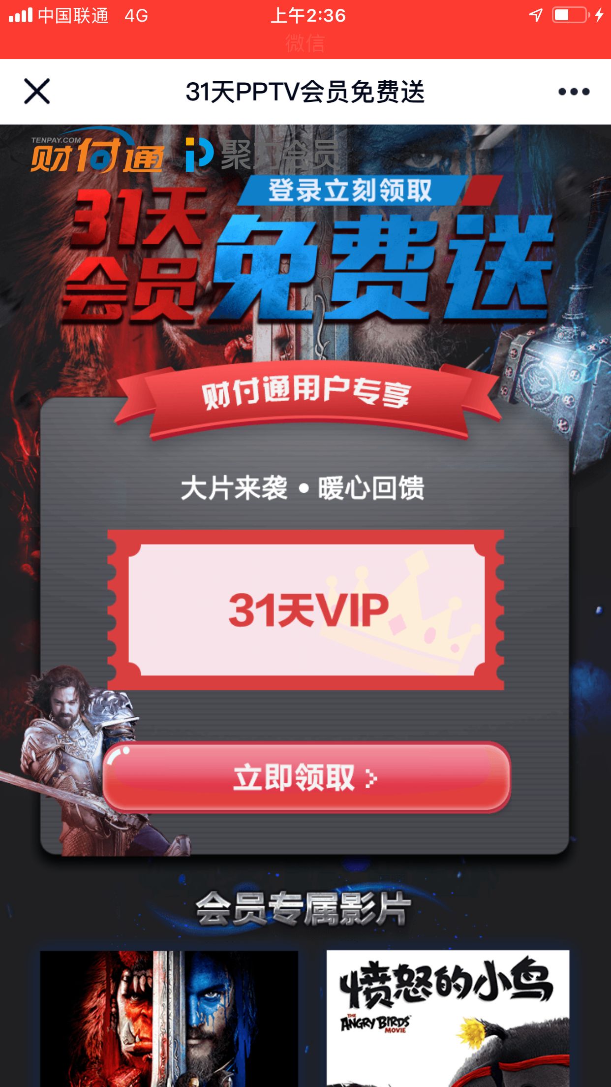 进去点击领取,登录账号即可,也是可以看电影的会员~