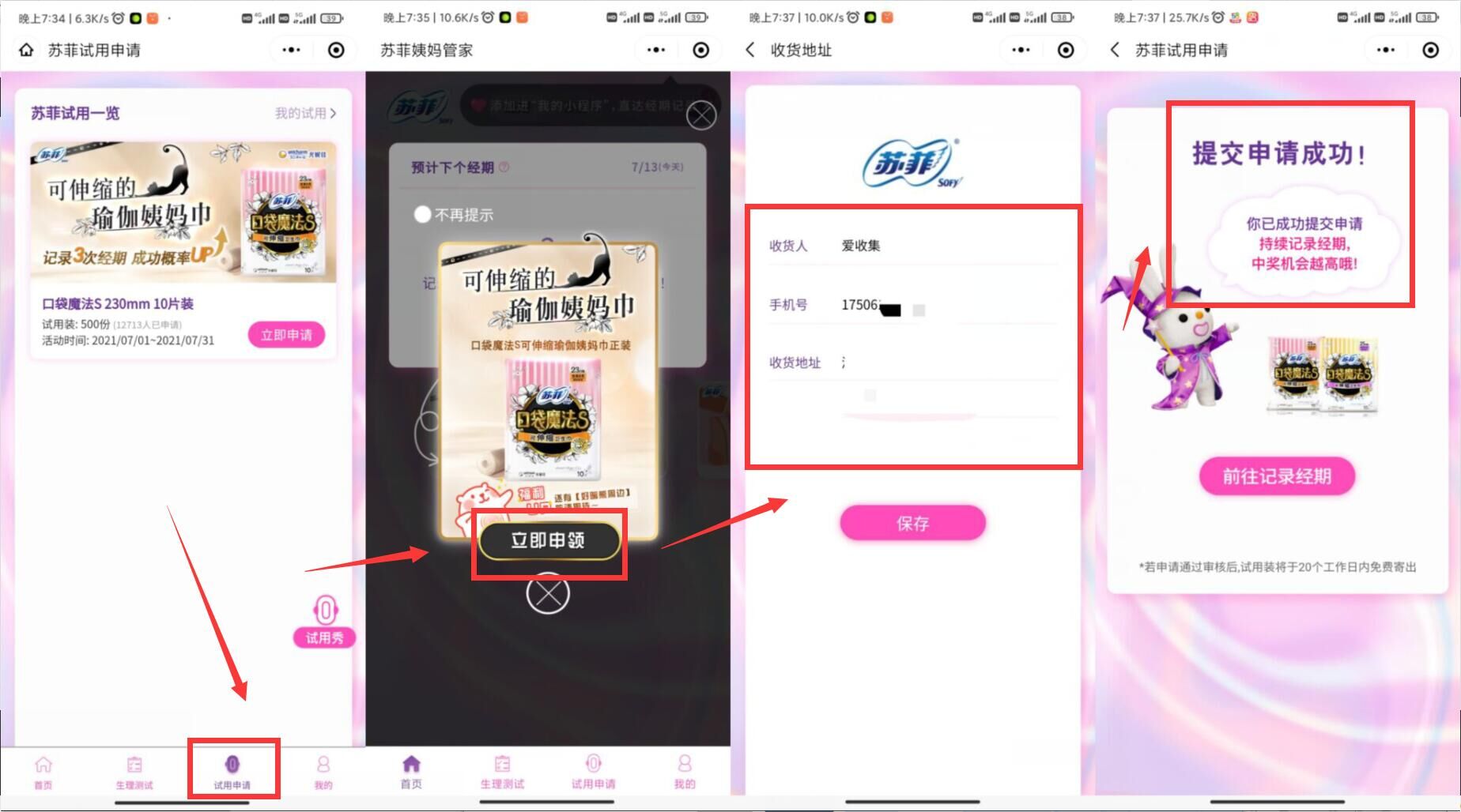 1、微信小程序搜索:“苏菲姨妈管家” 小程序 – 试用申请