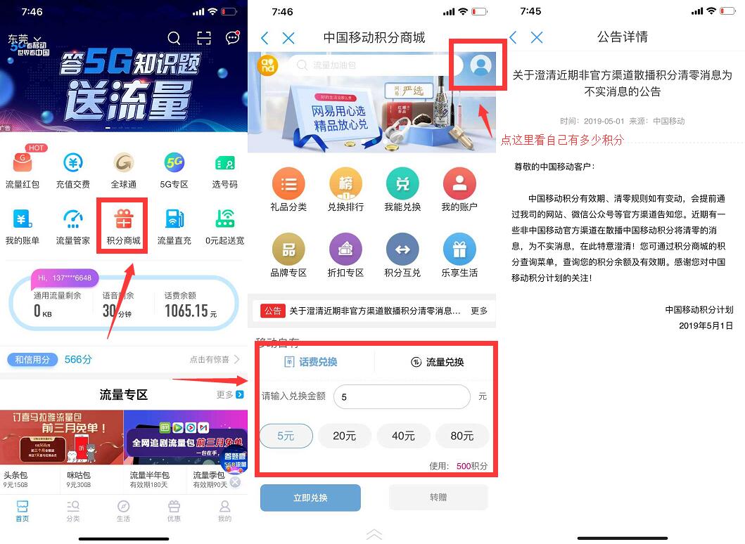 打开中国移动APP->积分商城->右上角看自己多少积分->500积分可以兑换5话费