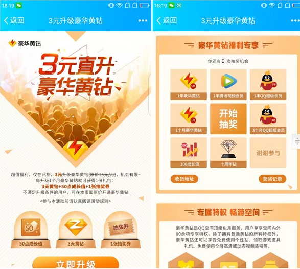黄钻超过1个月的可以3元升级豪华黄钻,还送3天和成长值~
