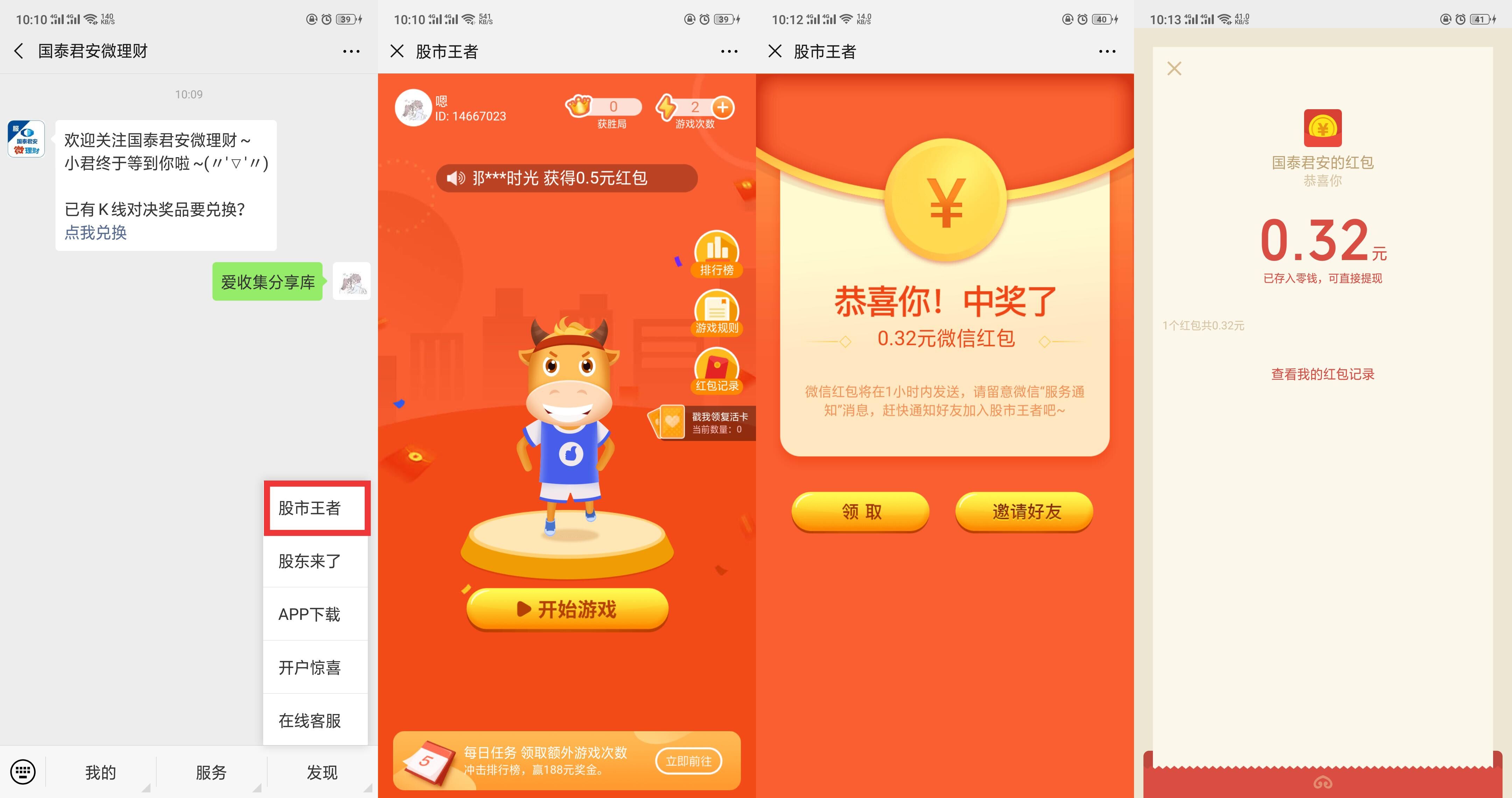 答题领红包->菜单栏“股市王者”进入玩游戏