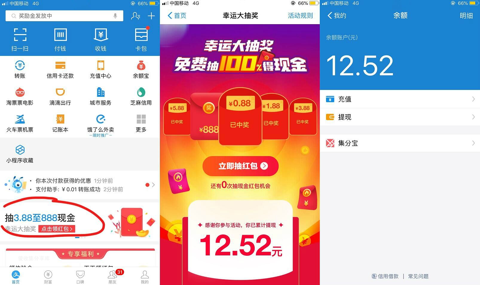 打开支付宝首页->中间横幅->进去抽红包->亲测12.52元秒到~