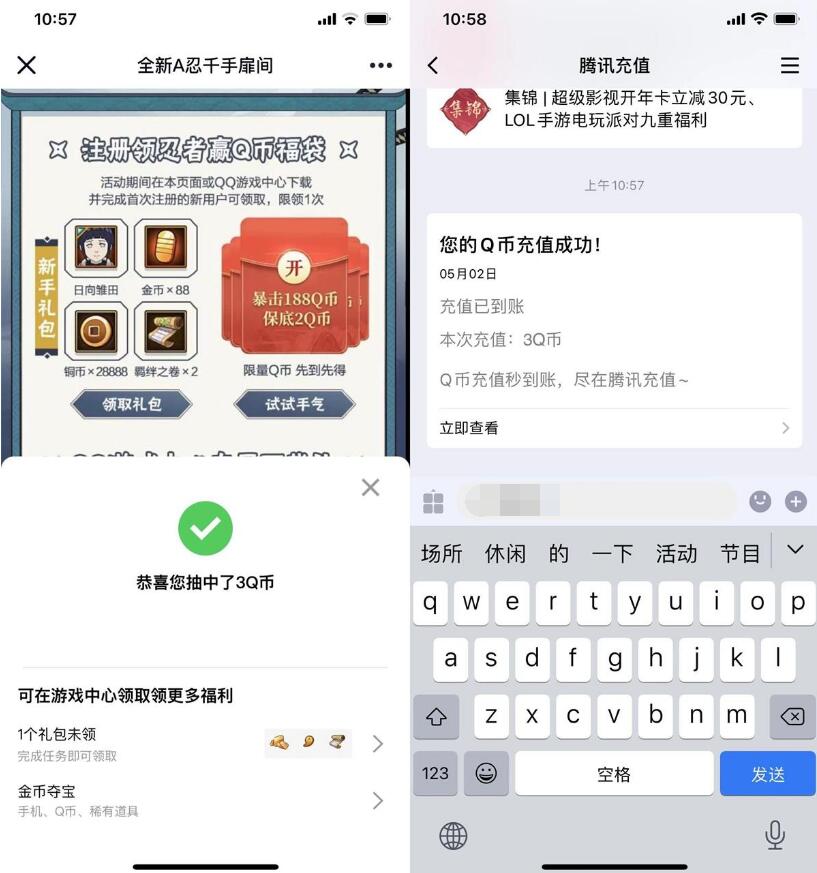 ”秒升20级->返回页面->领新手礼包->抽Q币