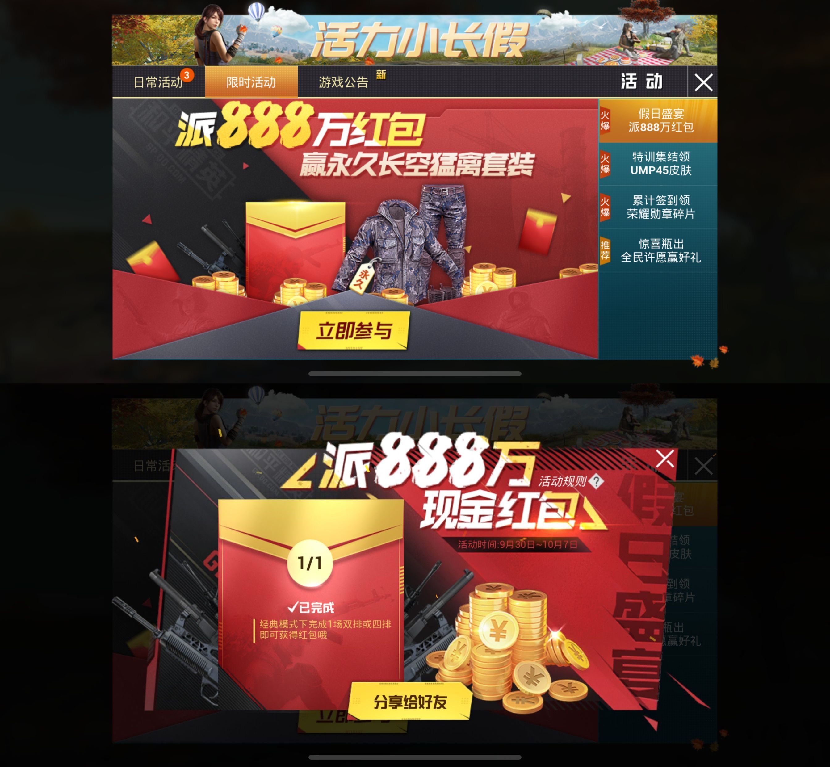 1.和平精英双排-进入游戏直接淘汰-结算页面有分享红包