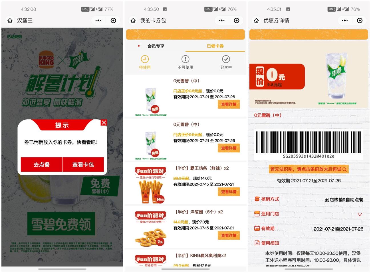 1、微信扫码点击领取(可以免费领两次)->领了后在小程序“汉堡王+”