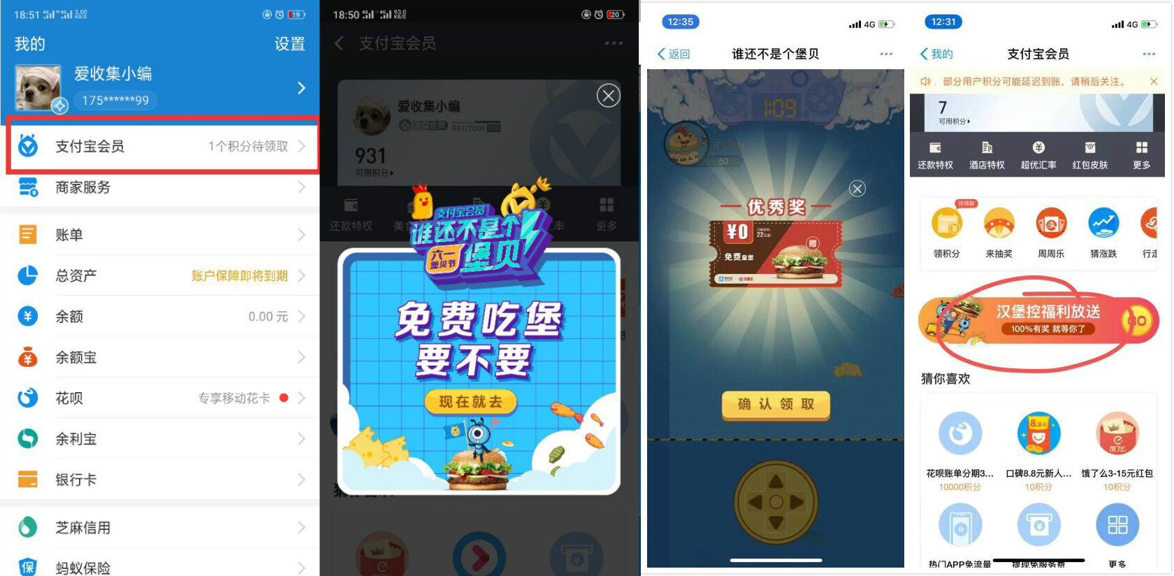 打开支付宝->会员中心->玩游戏得几率0元汉堡->横幅参与->领到直接到卡包!